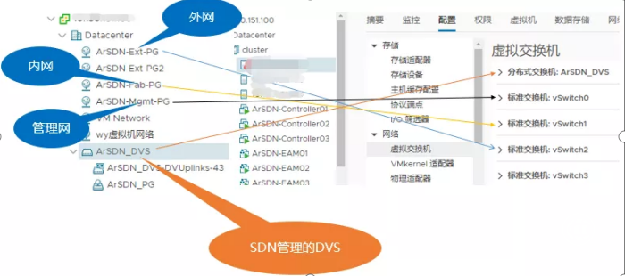在部署时,ArSDN会创建一个SDN独享的DVS,该DVS中的网络都是由SDN的控制器来维护。同时还会创建一些标准的switch来承载管理网的流量,以及ArSDN的tunnel流量。