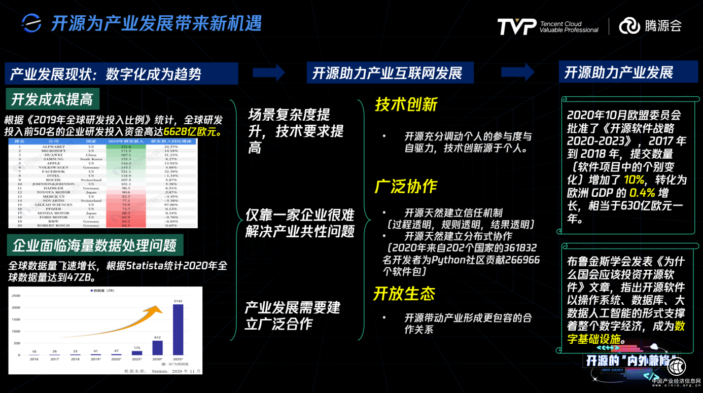 从产业发展的角度看,最近两年开源受到的重视程度远超以往,原因就在于契合了当下产业数字化的发展现状,通过技术创新、广泛协作、开放生态的有机结合助力产业互联网向前发展,最终实现了真正意义上的助推产业发展。