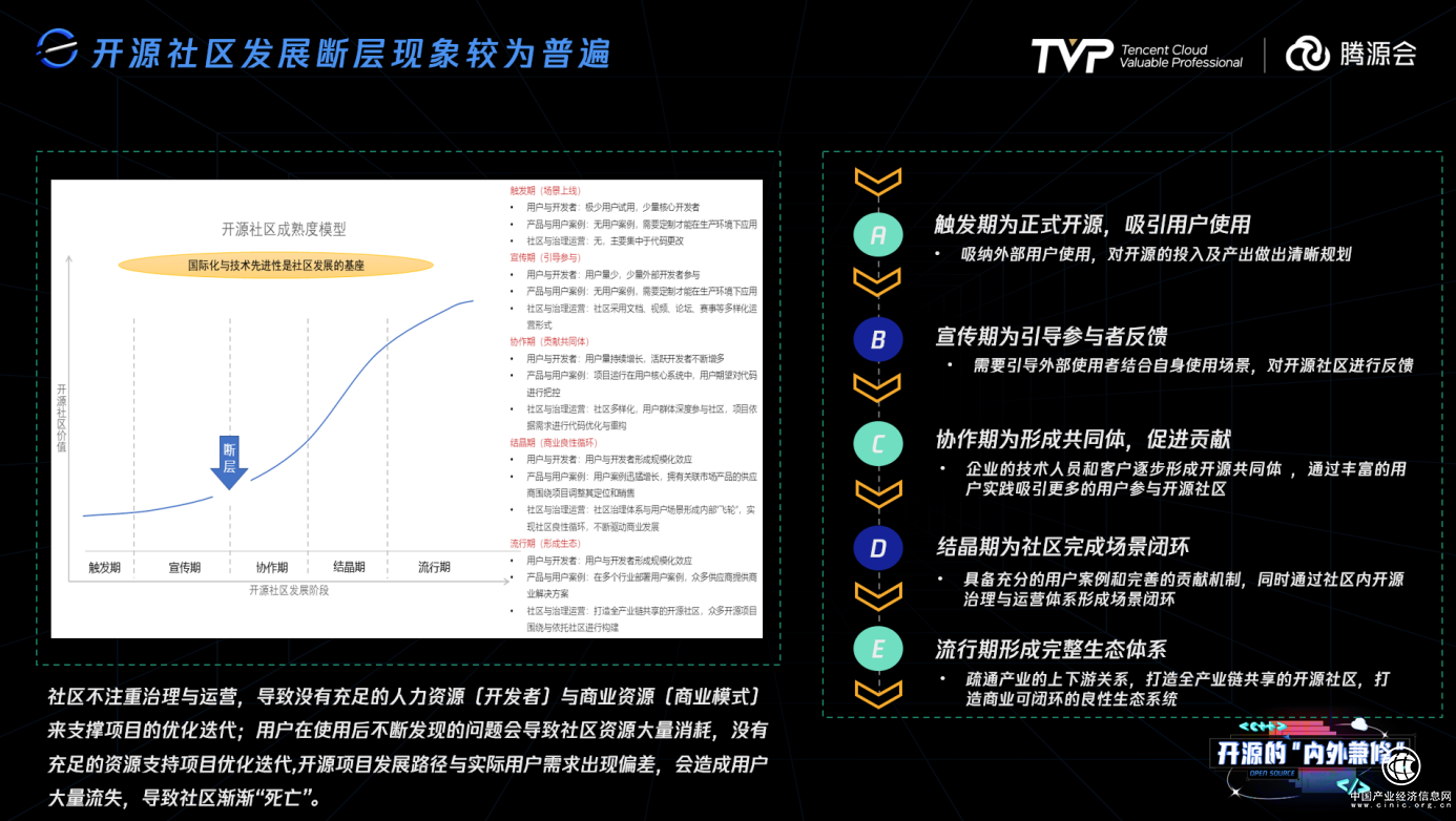 在当前的开源社区生态中,发展的断层现象尤为普遍。社区不注重治理与运营,导致没有充足的人力资源(开发者)与商业资源(商业模式)来支撑项目的优化迭代;用户在使用后不断发现的问题会导致社区资源大量消耗,没有充足的资源支持项目优化迭代,开源项目发展路径与实际用户需求出现偏差,会造成用户大量流失,导致社区渐渐“死亡”。