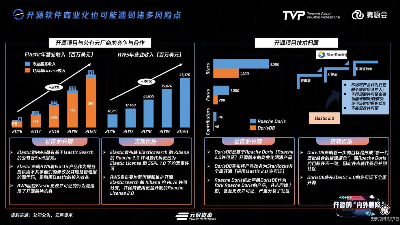 纵观近几年的中国开源,可以很清晰地看到国内对开源已经从拿来主义转向于反哺社区,中国企业、开发者在GitHub等开源平台上的贡献日益增长,已经成为了开源社区的中坚力量。但对于开源软件商业化而言,也可能遇到诸多风险,比如开源项目与公有云厂商的竞争与合作,比如开源项目技术的归属问题等,这些都是开源软件公司要去解决的问题。