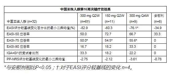 •本研究中,患者基线时的EASI评分中位数较低且呈非正态分布,为了降低这些偏倚产生的影响,分析了EASI评分较基线下降百分比的中位数:300 mg Q2W, 150 mg Q2W, 300 mg Q4W组分别下降79.3%, 64.7%, 72.4%,安慰剂组下降41.0%;显示出比EASI评分较基线变化百分比的最小二乘均值有更大的降低。