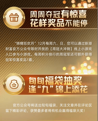 此外,为配合品牌升级活动,新湖财富还推出了惊喜福利,参与新湖财富官方公众号限时开放的线上小游戏,花样奖品赢不停,周周有好礼,旬旬发福袋,持续关注,积极互动,还有机会赢得让人惊艳不已的“超级锦鲤”重磅福袋。