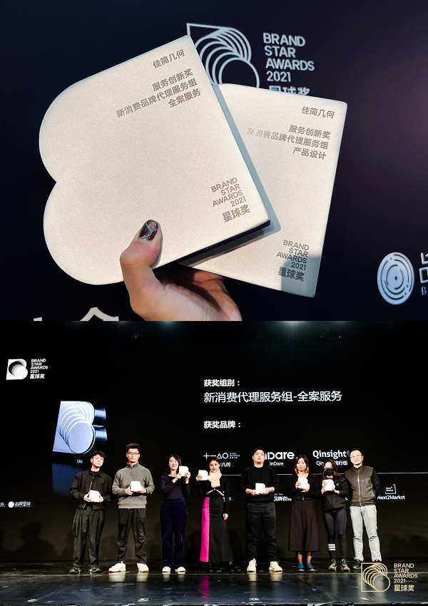 专注于品牌年轻化设计的佳简几何,一直是新消费品牌强有力的合作伙伴。在首届星球奖评选中,凭借着具有创新性的差异化产品设计实力以及从前端到后端全方位的个性化全案设计服务,佳简几何荣获“服务创新奖——新消费品牌代理服务组-产品设计”“服务创新奖——新消费品牌代理服务组-全案服务”两项大奖。