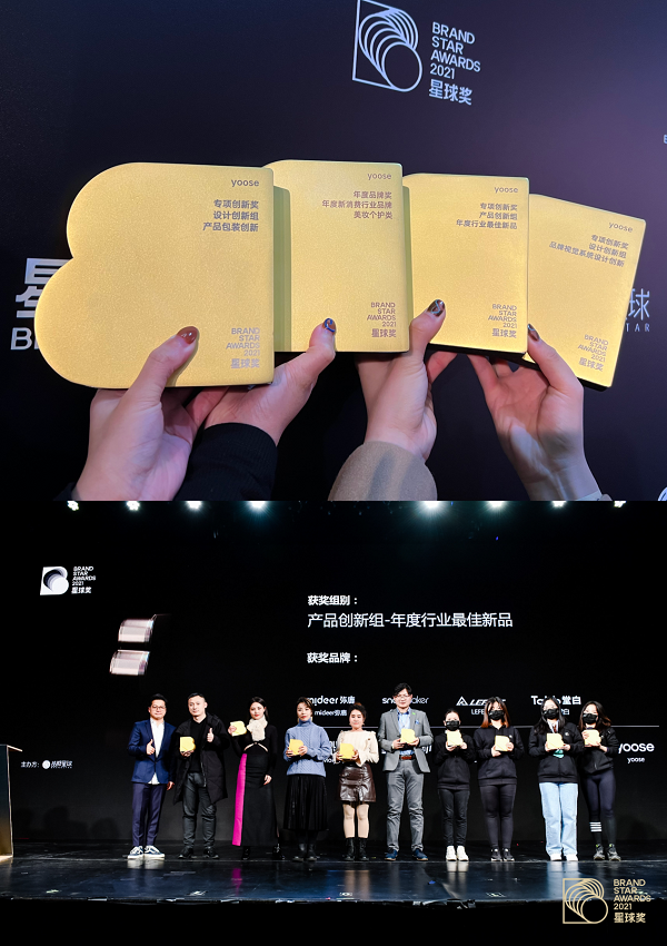 此外,佳简几何旗下原创设计潮流品牌yoose,突破传统个护产品思维,运用年轻另类的设计语言引领行业新潮流,荣获星球奖2021“年度品牌奖——年度新消费品类品牌”和“专项创新奖——设计创新组-品牌视觉系统设计创新”、“专项创新奖——设计创新组-产品包装创新”、“专项创新奖——产品创新组-年度行业最佳新品”四项大奖。