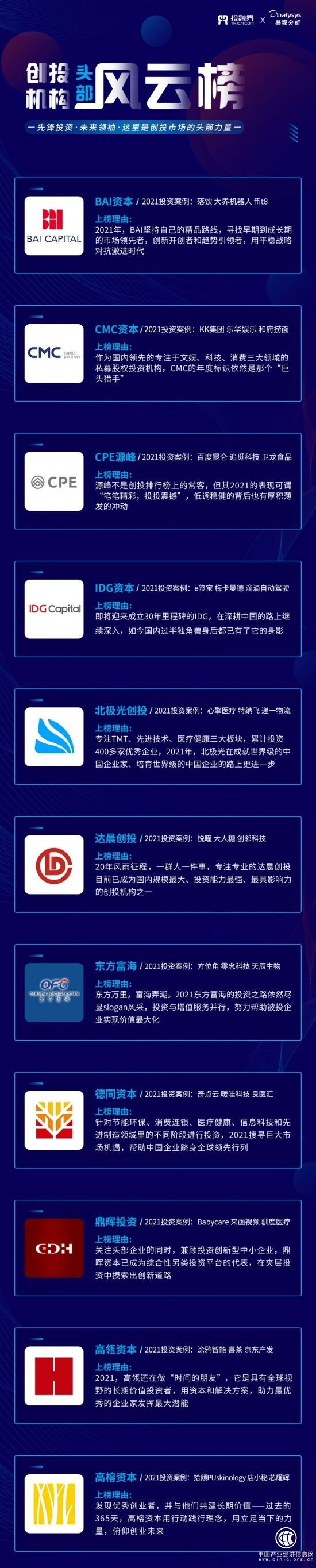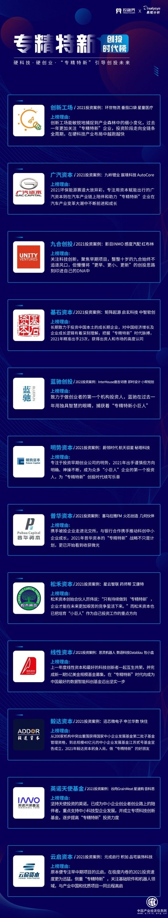 本榜单为新一年度针对创业投资领域全新设立的专业性榜单,在投融界、易观分析两大机构于多行业、多领域数据信息方面的专业加持下,突破了传统榜单的行业壁垒,聚焦头部创投机构、专精特新、数字经济、产业未来等多个维度,具有鲜明的领导性及时代性。