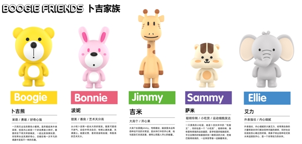 BOOGIE BEAR 卜吉熊IP品牌是由Boogie卜吉熊和它的四个小伙伴:兔子Bonnie(波妮)、松鼠Sammy(萨米)、大象Ellie(艾力)、长颈鹿Jimmy(吉米)组合而成。