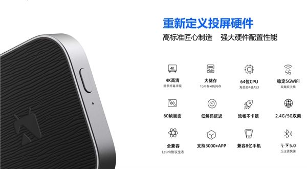 同时,乐播乐投凭借其快连接、低延迟、0卡顿等卓越的性能,成为了热门的投屏新科技产品。其内置海思64位四核旗舰芯片,可达到38毫秒肉眼无法感知的超低延迟,支持1080P/4K分辨率60帧蓝光级别的画质水平。此外,乐播乐投攻克了许多投屏软件无法突破的技术壁垒,除了稳定性更好,投屏质量更高之外,投屏过程中还能脱离手机保持工作,中途不影响用户接打电话、回复消息等其他操作;并且,乐播乐投还突破安卓系统级限制,解决安卓手机镜像大屏端没有声音的痛点。