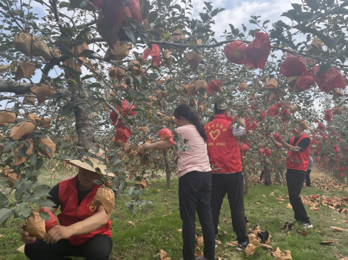 城区局“丝路爱心社”志愿服务队帮助零售户进行苹果摘袋