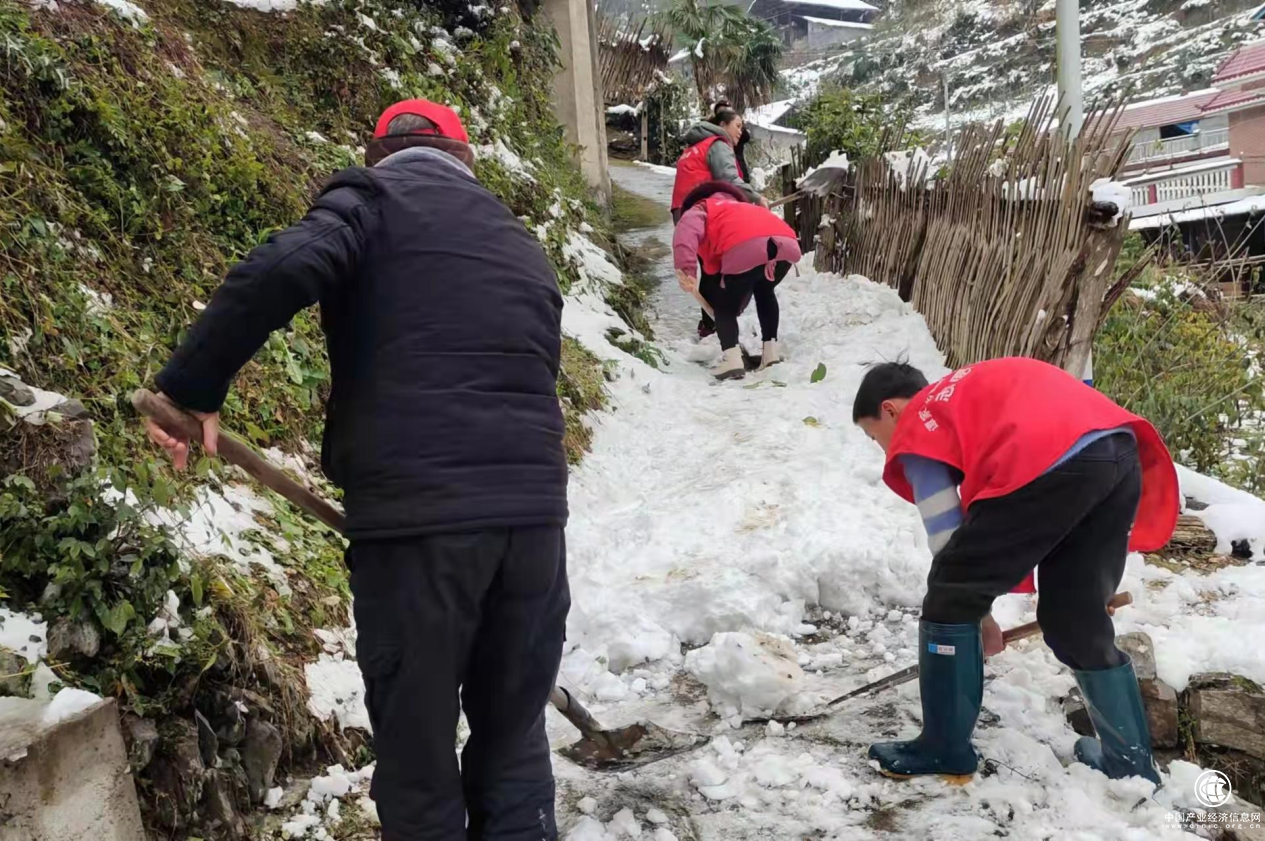 当天,志愿小分队带上锄头、铲子等除雪工具,挨家挨户清除路面积雪。“大家一定要仔细点,老人门口和道路上的积雪一定要全部铲除干净,因为晚上的温度会更低,不然积雪结了冰,老人们摔了就麻烦了。”乡村振兴驻村干部龚英明说道。