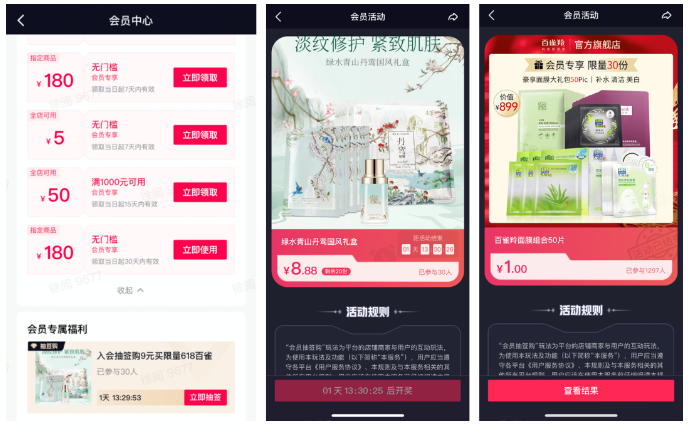 核心权益:会员抽签8.8元购古风礼盒/1元购50片面膜