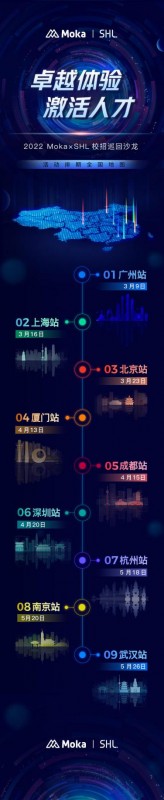 本次巡回沙龙将在广州、深圳、上海、北京、厦门、成都、杭州、南京、武汉等全国9个城市举办。Moka及SHL将邀请行业知名专家、知名企业嘉宾,为参会者带来校招专题分享、最佳实践分享、Moka最新校招解决方案等精彩内容。同时,本系列沙龙也会通过对校园招聘新洞察、多元化Z世代人才吸引、数字化校招流程建设、疫情影响下的校招应对举措等热点话题的解读,以及知名企业实际案例的分享,为企业输出更多校招干货。