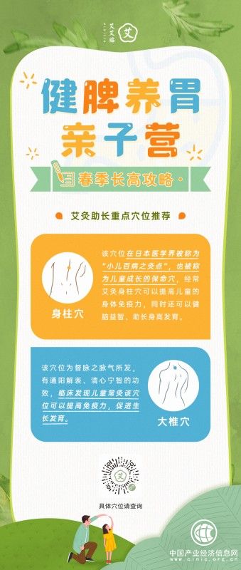 被称为“天下扶阳第一方”的艾灸,也是孩子长高的“法宝”,可艾灸命门、大椎、身柱、肺俞、肾俞、中脘、神阙、足三里等穴位。其中,命门穴能温肾助阳;肾俞穴能够补益肾气,培元固本;中脘,天枢主在养脾,进而加速生长发育。身柱穴一定不能错过,身柱穴有“增高穴”之称,所谓身柱,有全身之柱的含义,它是督脉之脉气所发,有通阳理气、祛风退热、清心宁志、降逆止嗽的功效,在日本医学界被称为“小儿百病之灸点”。