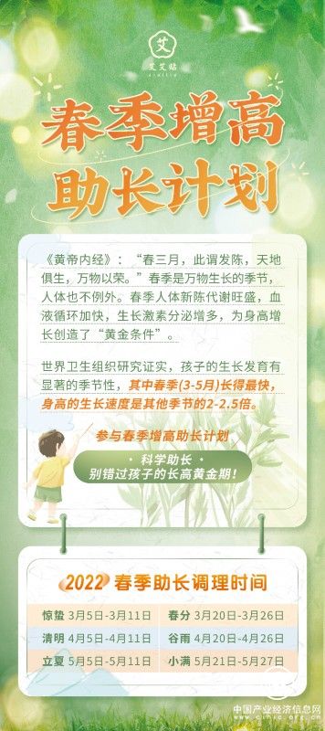 北京儿童医院儿童保健中心主任医师、特级专家张峰表示,除遗传因素外,运动、营养、睡眠等诸多后天因素也会影响孩子长高。以膳食搭配、艾灸、推拿、穴位贴敷等为切入点,艾艾贴特别推出由特约养生指导师、专业营养师制定的春季增高助长计划,帮助孩子激发自身生长能力,科学长高。