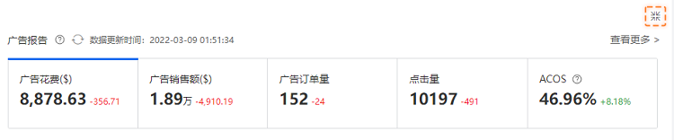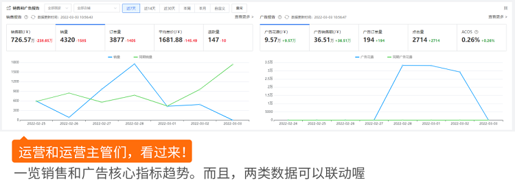 【销售和广告报告】可以帮助运营们看趋势抓方向,从核心数据出发把握店铺运营动态,检验之前的操作是否有效,之后的运营策略该如何调整优化。同时,可以点击【查看更多】,跳转查看更详细的数据。
