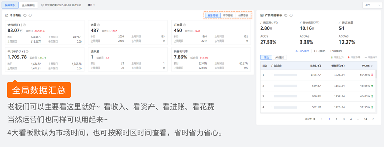 【4大即时看板】拥有销售看板、库存看板、结算看板、广告看板,让你只花10秒钟,就能掌握多个店铺的收入、花费、资产、回款等数据,快速决策,高效管理。数据按权限汇总,运营和老板同样可快速掌握今日整体情况。