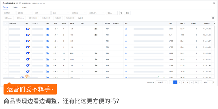 【商品销售看板】可以从国家、店铺、品牌、品类、运营状态、负责人等筛选数据,不仅可以查看单个商品的表现,跳转到商品分析页面看趋势,看历史数据,还可以直接改价。