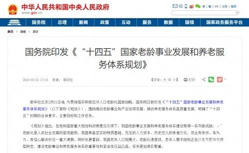 为应对老龄化以及支持养老产业发展,国务院日前印发《“十四五”国家老龄事业发展和养老服务体系规划》,《规划》提出了“十四五”时期的发展目标,即养老服务供给不断扩大,老年健康支撑体系更加健全;《规划》部署了9方面具体工作任务,包括织牢社会保障和兜底性养老服务网,扩大普惠型养老服务覆盖面,强化居家社区养老服务能力,完善老年健康支撑体系,大力发展银发经济,践行积极老龄观,营造老年友好型社会环境,增强发展要素支撑体系,维护老年人合法权益。标,推动全社会积极应对人口老龄化格局初步形成,让老年人获得感、幸福感、安全感显著提升。