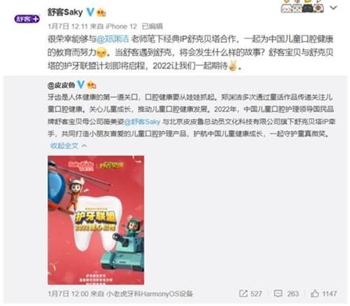 今年年初,北京皮皮鲁总动员文化科技有限公司官方微博宣布,舒客宝贝母公司薇美姿与北京皮皮鲁总动员文化旗下舒克贝塔IP已成功牵手,计划于2022共同打造小朋友喜爱的儿童口腔护理产品,护航中国儿童健康成长。随后,“童话大王”郑渊洁本人也转发了相关微博。本次舒客宝贝品牌在儿童口腔健康护理上与郑渊洁结缘,牵手合作“舒克贝塔IP”备受各方期待。