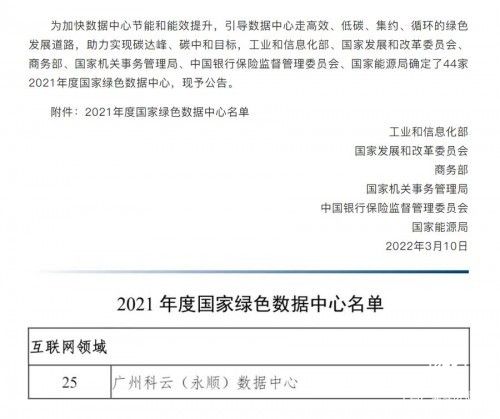 近日,工业和信息化部、国家发展和改革委员会、商务部、国家机关事务管理局、银保监会、国家能源局六部委联合公布2021年度“国家绿色数据中心”名单。科华数据广州科云(永顺)数据中心,凭借高效的能耗指标,先进的节能技术及智能化运维管理手段,经相关主管部门推荐及行业专家评审,成功入选“2021年度国家绿色数据中心”名单。国家绿色数据中心评定工作,旨在推动绿色数据中心建设,助力国家“双碳”政策落地。
