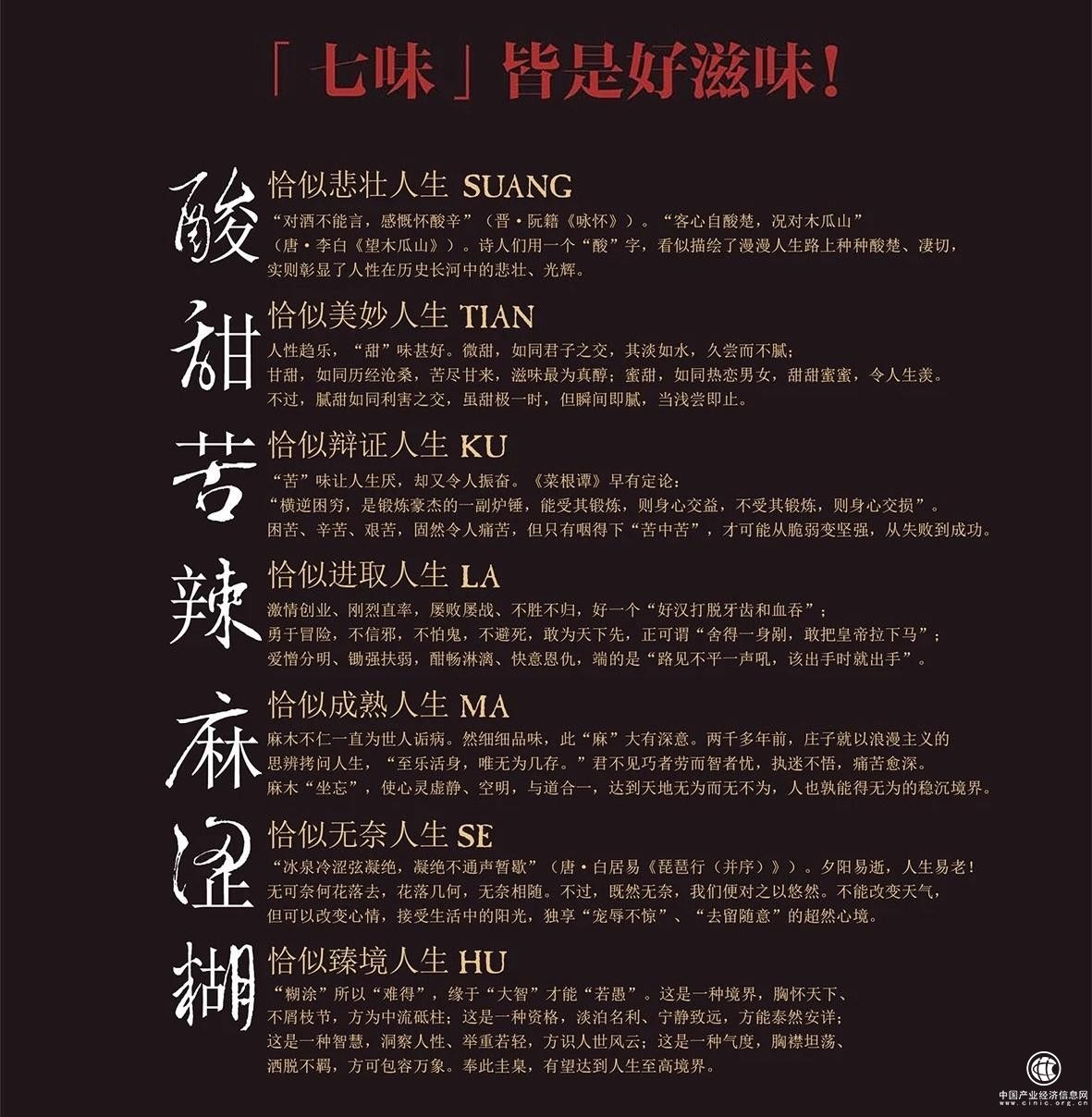 七味坊酒,由七次所取之酒勾调而成,蕴含酸、甜、苦、辣、麻、涩、糊七种味道,以七味相伴寓意人生,七味坊缺一味而非酒,人生少一味则无趣。七味坊酒,正是这七味相调的美酒。七味之韵,韵在七情相佐,化人生百态。七味坊酒以酸化悲壮,以甜化美妙,以苦化辩证,以辣化进取,以麻化成熟,以涩化无奈,最后以糊化臻境,近而达到人生至高境界。七味坊酒,正是这八方来聚的好友。劝君更进一杯酒,西出阳关无故人。美酒就好比好友,随着时间的推移,酒越发的甘甜醇香,人越发的爱你懂你。