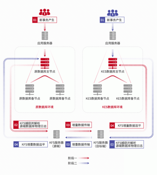 阶段一:结合柔性迁移过程,在解决存量数据迁移及增量数据同步后,保持KFS从原系统数据库到KES的链路畅通。此时系统运行仍基于原数据库。