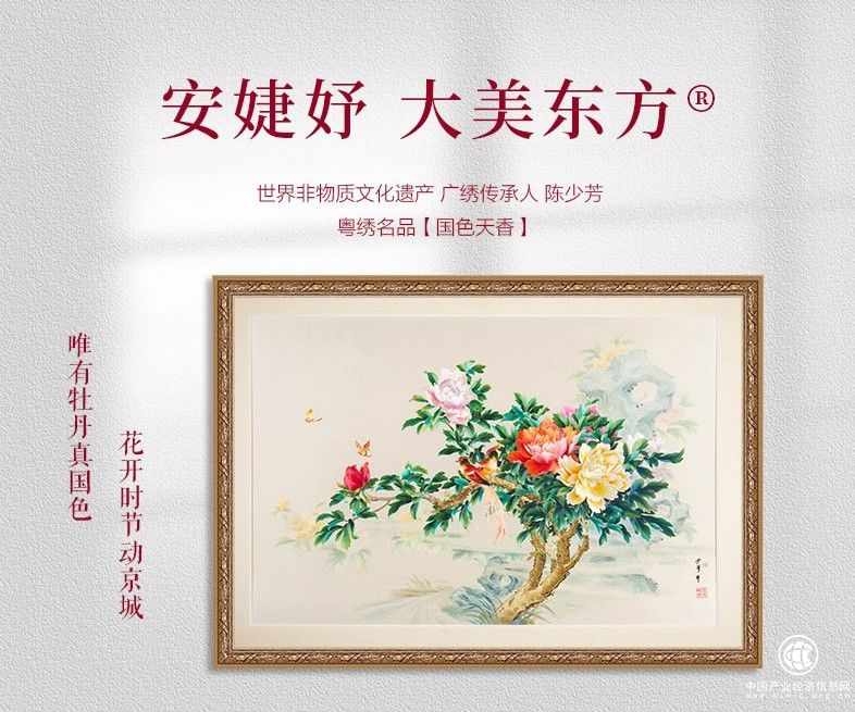安婕妤以“安婕妤大美东方”为slogan,以国色天香的牡丹为灵感,联手国家级非物质文化遗产粤绣项目广东省级代表性传承人谭展鹏,承袭其母亲——广绣国家级传承人陈少芳的粤绣名品《国色天香》,匠心打造国潮牡丹系列。产品外包装以粤绣为载体,每一针一线都蕴含深厚的手工技术与博大精深的民族文化底蕴,一经推出便深受消费者喜爱。