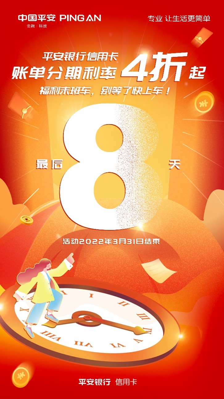 最近,平安银行信用卡账单分期有4折起优惠!倒计时8天,有分期还款需求的朋友赶紧来看看。全额还款有压力,账单分期可以在一定程度上缓解还款压力,而且现在赶上平安银行信用卡的分期利率优惠活动,还能省不少。