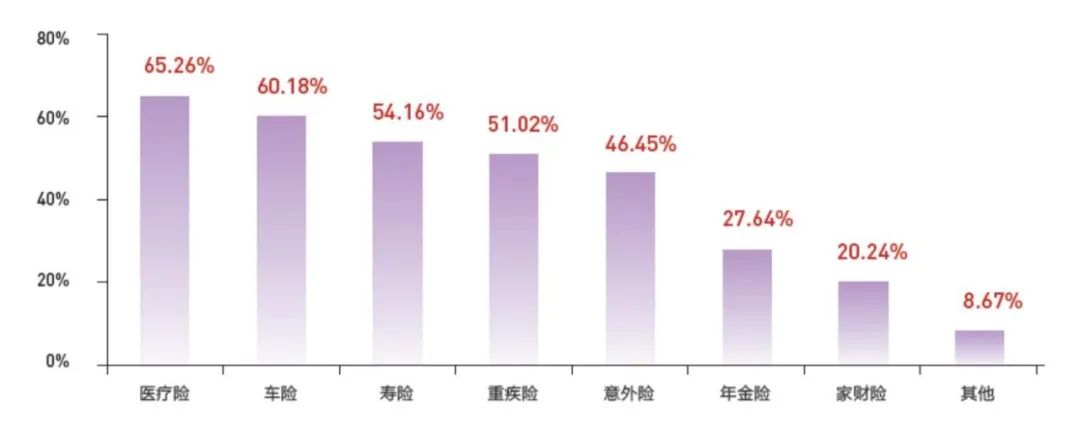 根据《白皮书》中披露的数据,目前,保险消费人群主要消费的险种中,医疗险和车险处于领先位置,配置的人群比例分别达到65.26%、60.18%。其次是寿险和重疾险,配置的人群比例分别为54.16%和51.02%。