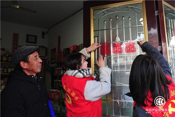 (图为余姚市烟草专卖局香溢志愿队在春节前夕前往四明山区为零售客户打扫柜台,张贴节日气氛的窗花)
