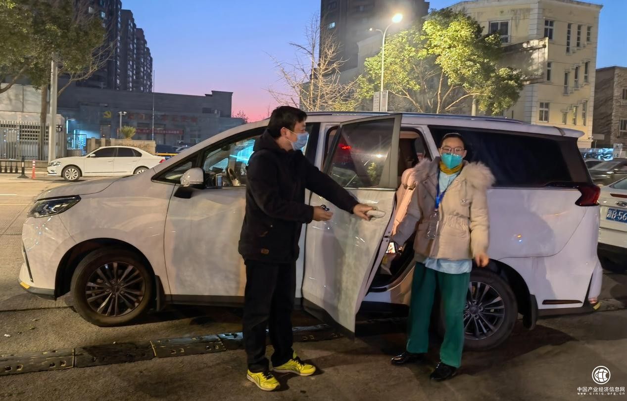 (图为:志愿者刘华在医护人员临时集合点,用私家车载送他们前往辖区核酸采样点。)