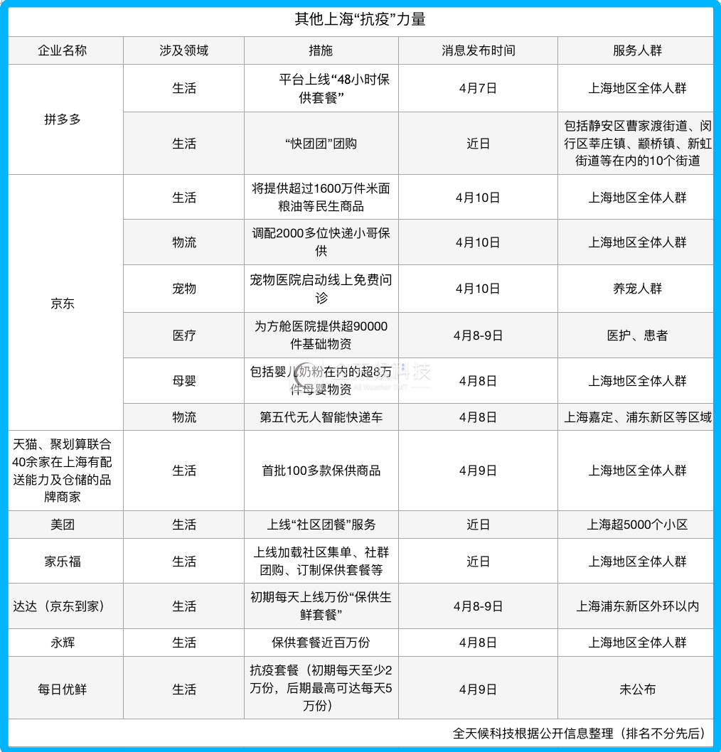 4月10日,官方通报,截至9日,上海已有出院患者和解除医学观察人员11000多人。上海杨浦首批商超、便利店、餐饮等身边小店和药店正在陆续恢复运营,京东、拼多多、天猫等电商渠道也在逐步打通、接受订单,每日优鲜、叮咚买菜等生鲜电商又开始回归个人订单业务,线上线下保障居民生活的行业都已启动。