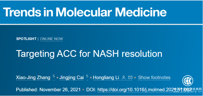 2022年1月28日,国际权威杂志Trends in Molecular Medicine特邀武汉大学李红良教授发表评论文章,题为“Targeting ACC for NASH resolution”。该文章深入解析了靶向ACC治疗NASH的临床应用前景和困境,评述了Nature Medicine最近发表的辉瑞公司ACC抑制剂治疗NASH的临床试验进展,更提出了靶向ACC治疗NASH的新方向和新理念。