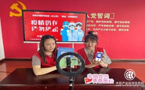 图为:余姚市烟草专卖局财务人员徐则茜为零售户解读《宁波市稳链纾困助企若干措施的通知》