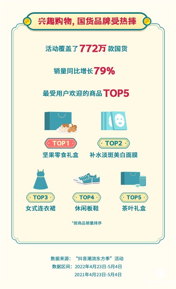 4月23日至5月4日,为期12天的“抖音潮流东方季”活动收官,该活动聚焦国货、老字号、传统手工艺品,满足消费者在衣食住行各方面的购物需求。活动期间,该平台国货销量稳定走高,同比增长79%。其中,汉服深受用户青睐,销量同比增长312%。