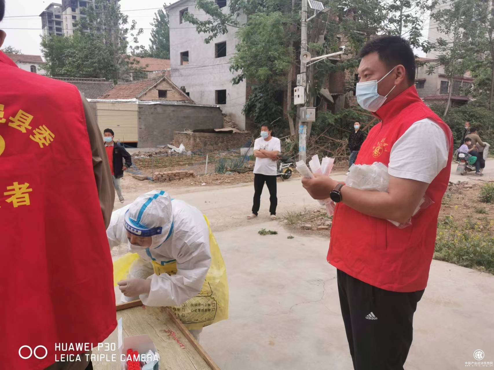 党员赵振亚骑车带着医务工作人员在鹿邑县红星社区入户开展核酸样本采集