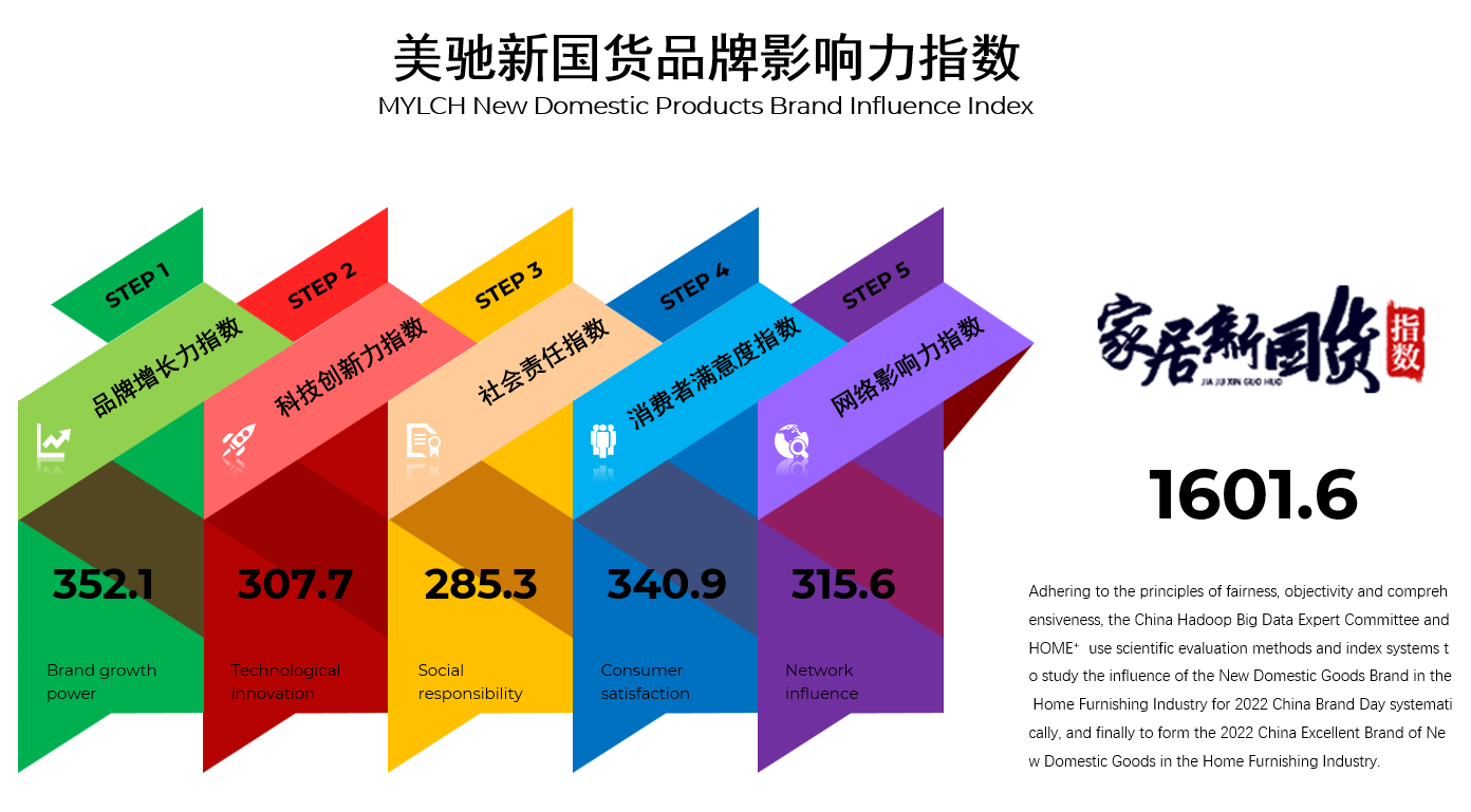 据报告显示,美驰门窗在品牌增长力指数、科技创新力指数、企业社会责任指数、消费者满意度指数、网络影响力指数五大维度表现都很突出,以1601.6的影响力总指数稳居榜单。