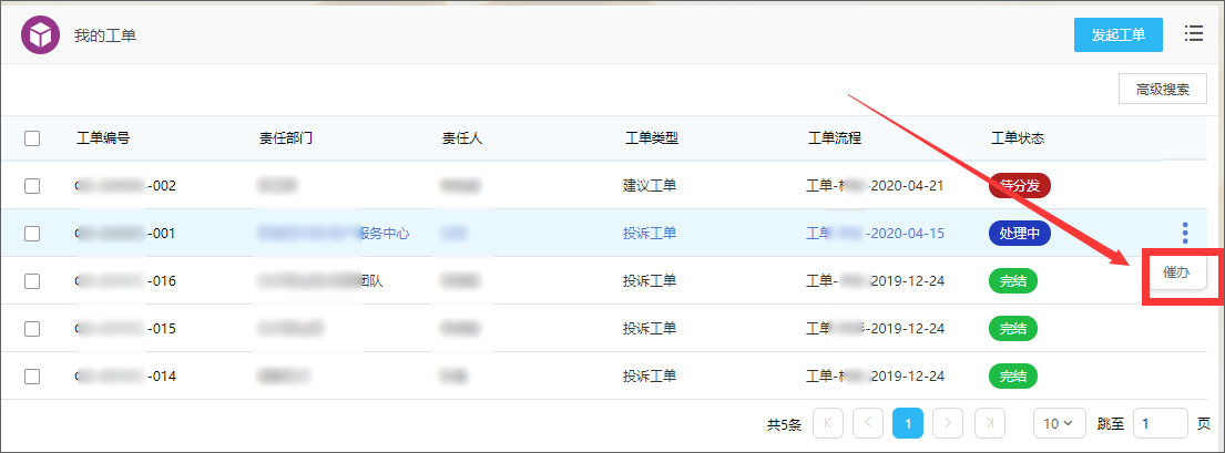 可在我的工单界面中快速发起工单,在我的工单里可以直接进行工单催办。