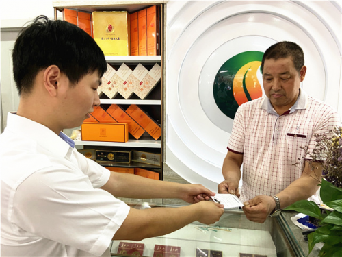 图为:青年员工向辖区内客户发放了《宁波烟草廉政监督卡》,主动接受客户的监督,让专卖执法、客户服务经得起阳光检验,筑牢防腐拒变的防线