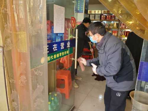 该局职工在做好疫情防控要求的前提下,实地拜访辖区零售客户,帮助客户对店铺进行杀菌消毒,为客户发放医用口罩、医用酒精、防护手套、消毒液、体温计等防疫物资,宣传当前疫情防控的相关政策,提醒客户对进入店铺的顾客查验“行程码”、“健康码”、“场所码”,最大限度减少和避免人员聚集。同时,营销人员利用自身专业技能,帮助零售客户做好商品陈列,为客户整理店铺,提升客户店面形象。