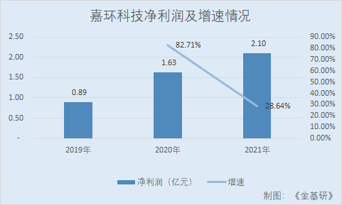 2019-2021年,嘉环科技营业收入分别为0.89亿元、1.63亿元、2.1亿元,2020-2021年分别同比增长82.71%、28.64%。