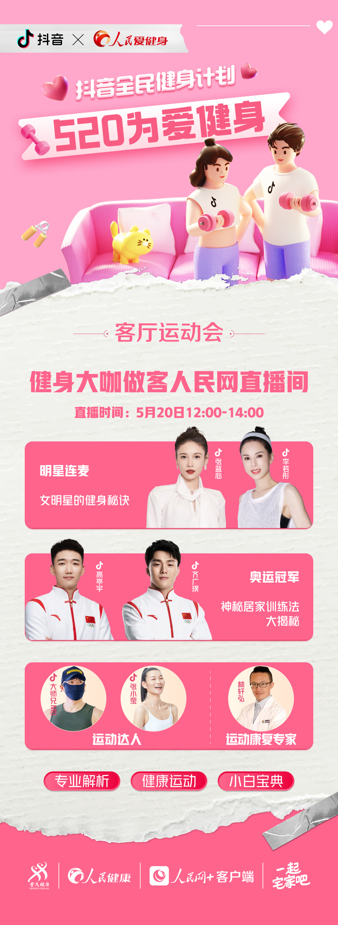 人民网将与明星张蓝心、李若彤,奥运冠军运动员齐广璞、高亭宇以及健身达人大师兄、张晓莹,康复专家林轩弘直播连麦,共同探讨健康运动话题,无论你是健身爱好者、运动小白还是想培养健身习惯的普通用户,都可以在这里获得交流、互动的机会。这一举措在一定程度上可以帮助人们打破对健身运动的危险性思维壁垒,进而助推亿万抖音用户开始健身,爱上健身,加入“全民健身计划”,为建设健康中国和体育强国提供助力。