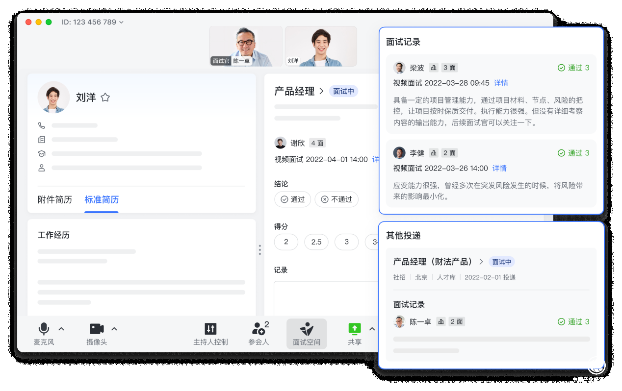 从人才进入企业开始,飞书People便承载了科学选材的重任。飞书招聘的三合一工作台,将候选人的简历、面试评价、过往面试等信息集纳到同一页面中,能够帮助面试官基于更全面的信息对人才进行判断。