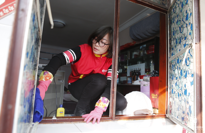 图为黄丽在所创建的“青春关爱夕阳红”活动中带头为老同志打扫家居卫生