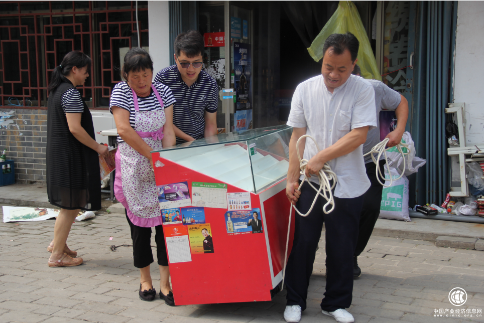 图为杨红波和零售客户一起探讨“生意经