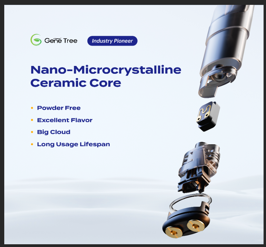 吉迩陶瓷雾化技术致力于成为雾化技术的引领者,通过纳米微晶材料与技术创新,为客户带来自然愉悦的雾化体验。吉迩纳米微晶陶瓷雾化技术从厚膜技术到薄膜技术、从线加热面加热到体加热,不断优化雾化芯数据模型,不断提升研发实力,解决行业雾化芯痛点。已推出Gene Tree厚膜技术,具备不掉粉不粘粉,产品更安心,雾化更充分,寿命更长久,还原度更高等5大技术优势。