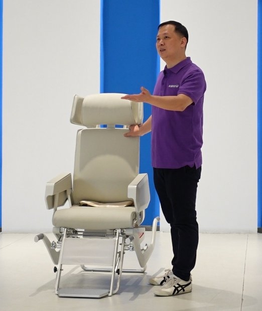 经记者多方探访了解,这张特别的“护航椅”是中国航天为了航天员落地后能够更好的进行身体重力再适应而向广东中山的坐感科技公司专门定制的“减重力护航椅”。