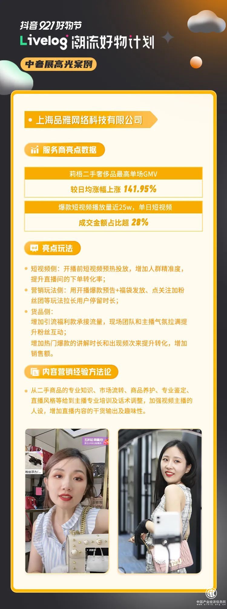 在内容方面,“如何吸引更多的兴趣流量”是关键。抖音电商服务商为二手奢侈品行业潜力商家提供了平台专属流量扶持政策,并为奢展中心直播商家提供了10间设计直播间等设施支持,全面解决困扰中小商家的“流量之痛”与“场景之痛”。此外,抖音电商服务商「最爱的中古包」livelog主题活动还借助「抖音921好物节」大促节点,借助短视频、直播、泛商城等渠道大促,助力二手奢侈品迎来第三季度交易高峰。