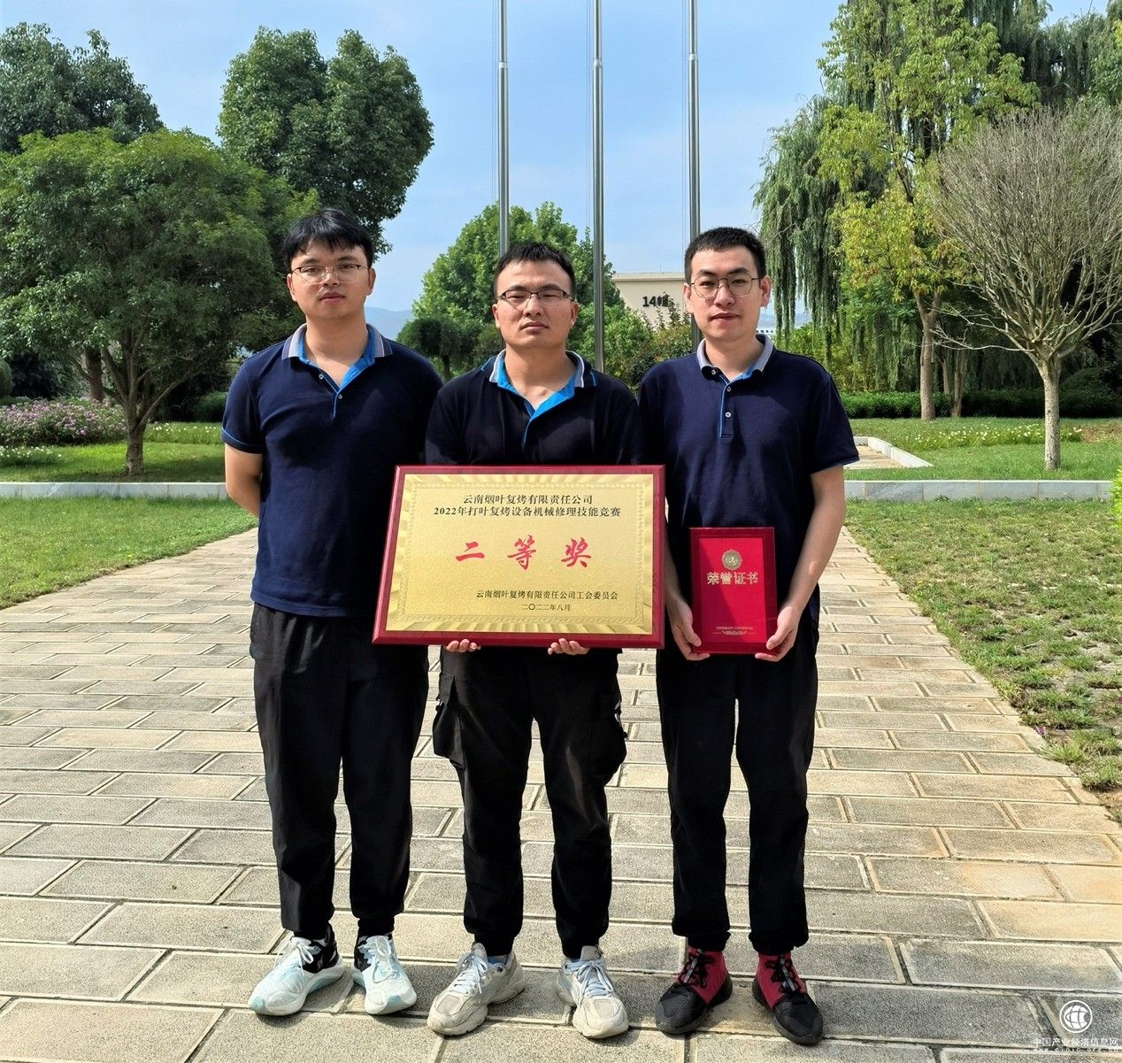 在云南烟叶复烤公司2022年打叶复烤设备机械修理技能竞赛中,张恺(左)所在的宣威复烤厂代表队获得团体二等奖。(夏自麟 供图)