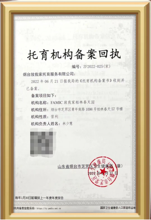2022年6月21日,烟台市芝罘区卫健局为FAMIC放我家颁发了家庭托育点备案回执,这是山东省乃至全国首张家庭托育备案的“牌照”,该备案回执,说明家庭托育可以备案了,可以领“证”了!