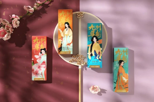 以《诗经》名篇为意象原型,将其中提及的色调作为彩瞳主颜色,并将诗中描绘的人物感觉对应到彩瞳给人带来的风格上,如将“窈窕淑女”、“蒹葭苍苍”、“桃之夭夭”、“美目盼兮”具象化,再结合当下流行的国潮绘画画风,推出了“九州寻色·诗经”系列。